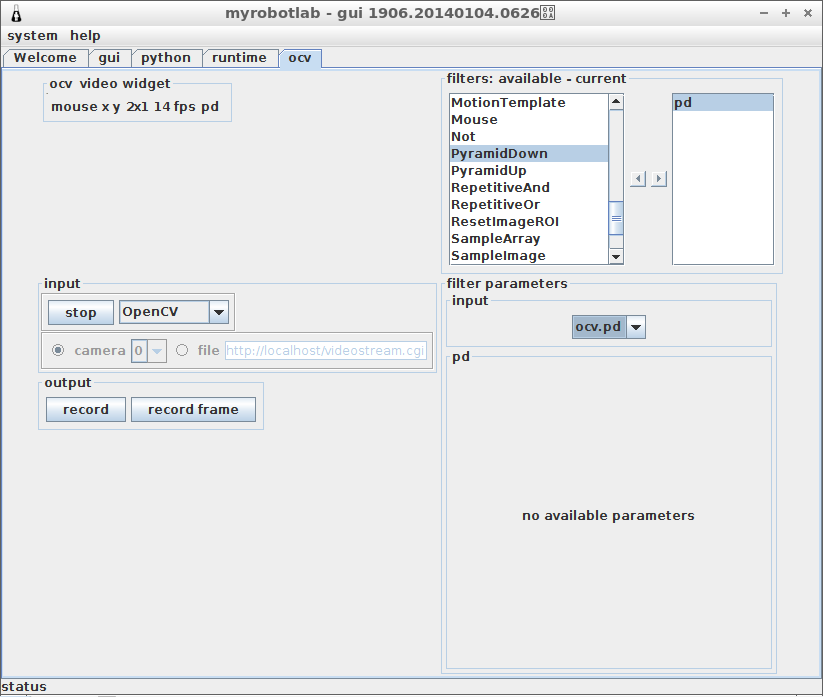 A far as the bug - I think the issue is I don't have the "blanked" drop down labled clearly .. it should be "input" .. so when its blank its processing the input from the camera. What you did is set the input of the PyramidDown filter to its own output ....