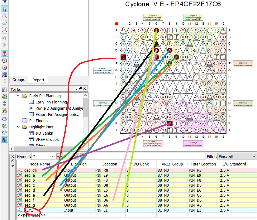 Fire up the Pin Assignment Gui and drag and drop the seg_a ,b,c,d,e,f,g to the relevant output pins and also the tactile switch KEY1 to pin E1 which will be the up/down counter control.